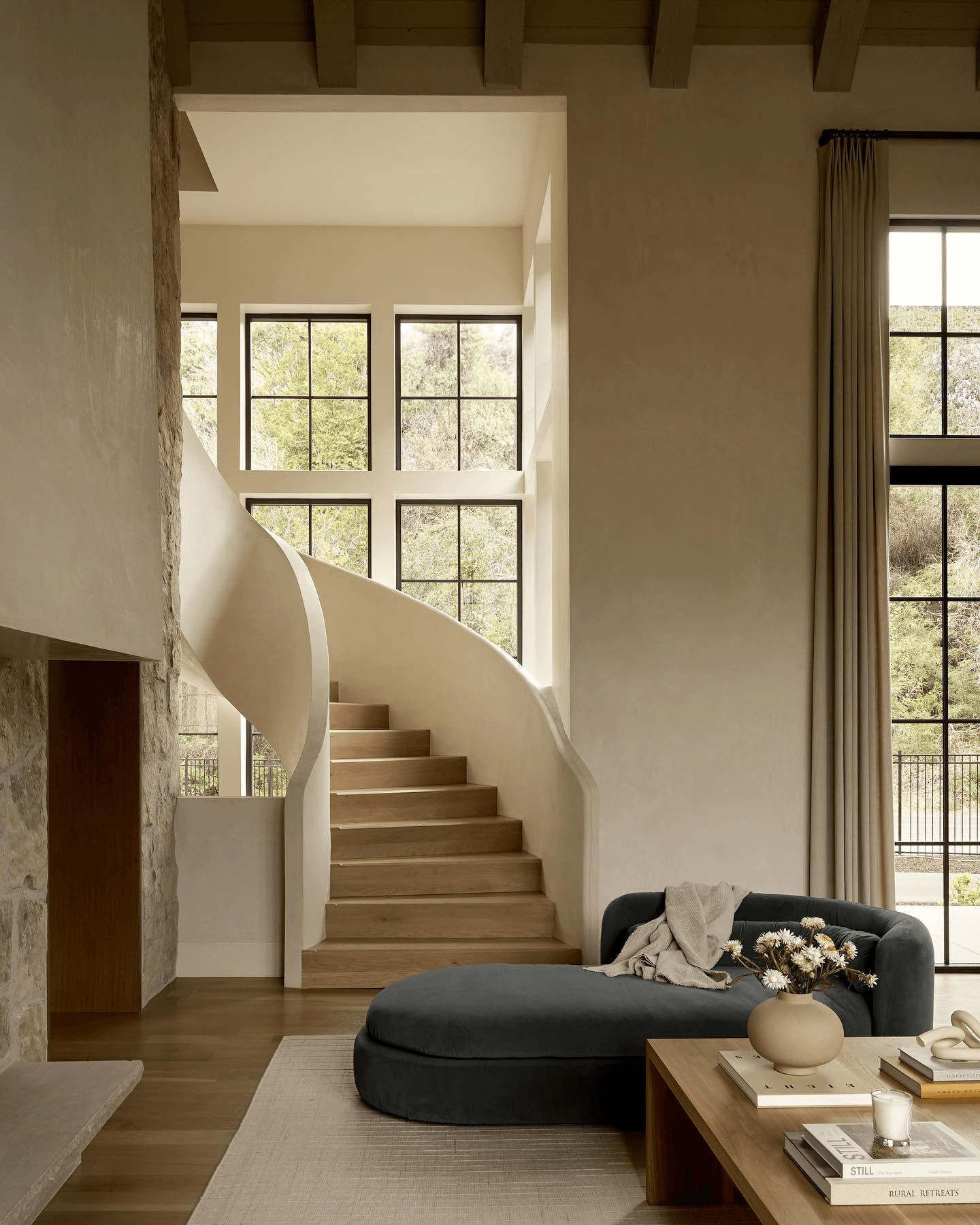 For this private residence, the architectural brief called for a sculptural, sweeping staircase that would serve as the central focal point of the living space. The design required materials that could balance the smooth, monolithic form of the plastered balustrade with warmth and natural texture.